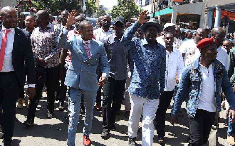 Raila Odinga accompanied by Felix Odiwuor (left) MP Langata and Babu Owino MP Embakasi East Constituency on a meet the people tour along Muindi Mbingu street, Wabera street, City hall way and Moi Avenue on October 11, 2022. [Jonah Onyango, Standard]