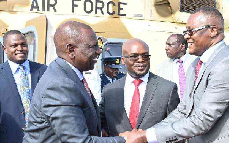 President William Ruto with ICT CS nominee Eliud Owalo at African Inland Church in Homa Bay on October 2, 2022. [Rebecca Nduku, Standard]