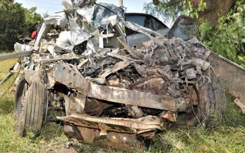 Wreck of a saloon car in which five people died at Naro-Moru area along the Nyeri-Nanyuki highway in June 2020. [Mose Sammy, Standard]