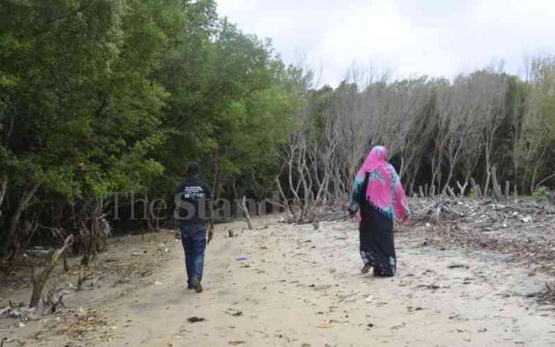 Riziki Bwanake (right) at a degraded mangrove area in Kipini, Kilifi County. [Caroline Chebet, Standard]