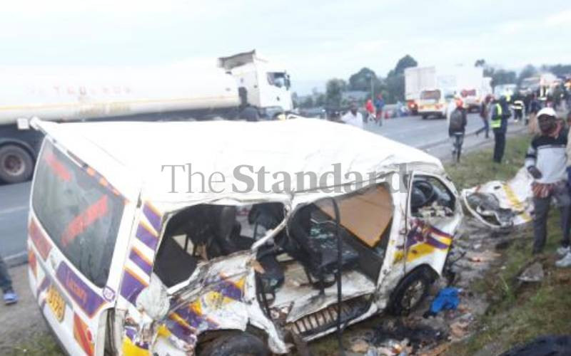 The wreckage of a matatu involved in a crash at Ngata area along the Nakuru -Eldoret highway on December 13, 2022. [Kipsang Joseph, Standard]