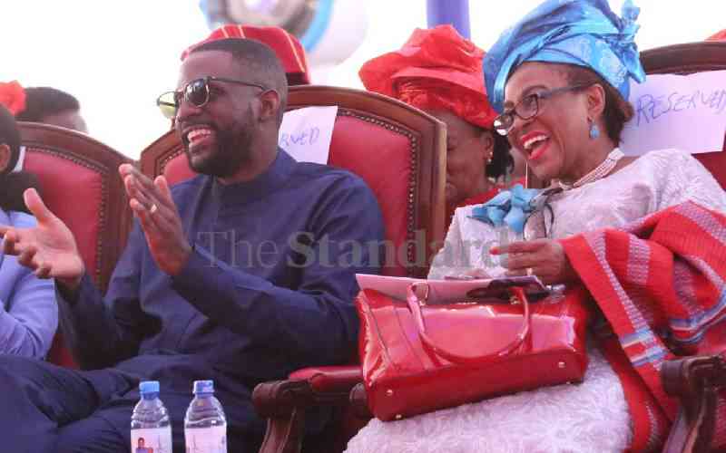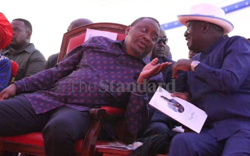 Former President Uhuru Kenyatta and Azimio la Umoja leader Raila Odinga at George Magoha's funeral service in Siaya County. [Collins Oduor, Standard]