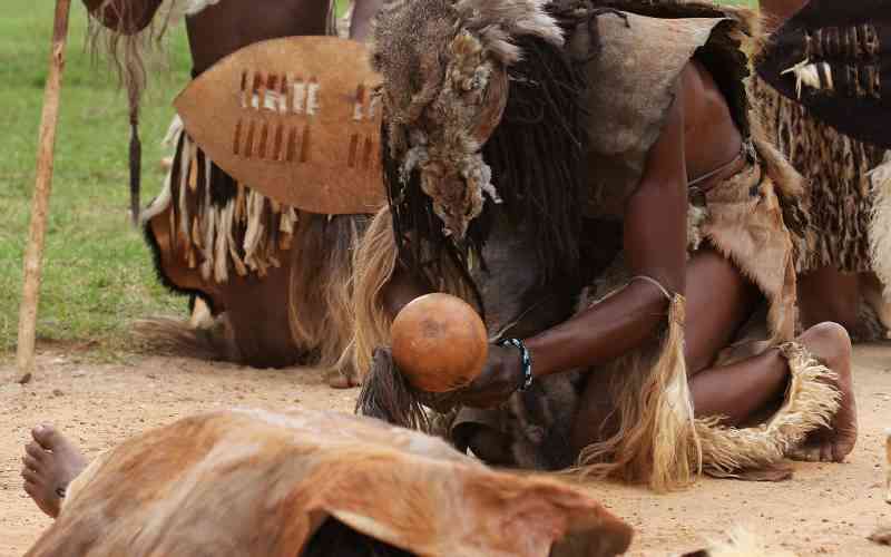 An enactment of a Zulu death ritual, showing the Witchdoctor or Sangoma in the foregroung and behind, the Zulu warriors. [File, Standard]