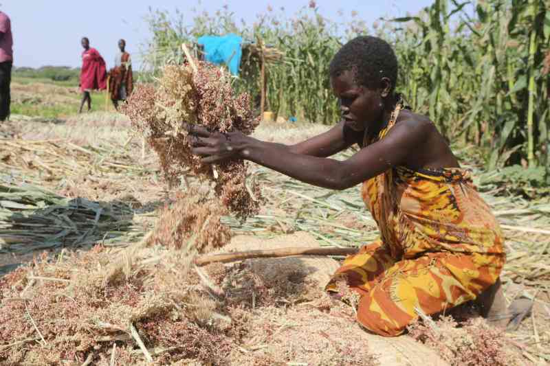 Turkana Alice Amana prepares millet produce at Natirai farm Loima Sub Location Turkana County. [Peter Ochieng, Standard]