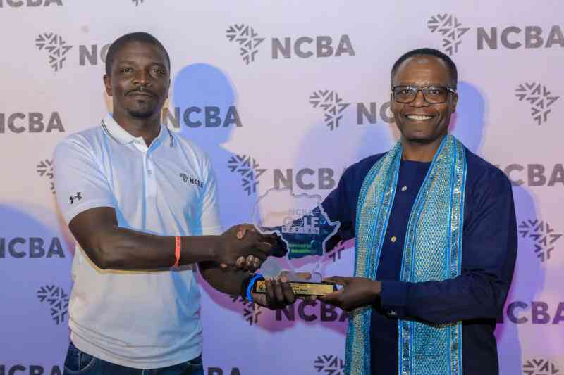Kitale Golf Club's Philip Shiharsy (L) is awarded his winner's trophy by NCBA Group Managing Director John Gachora after emerging as the overall winner of the 2023 NCBA Golf Series at Sigona Golf Club on December 1. [Courtesy]
