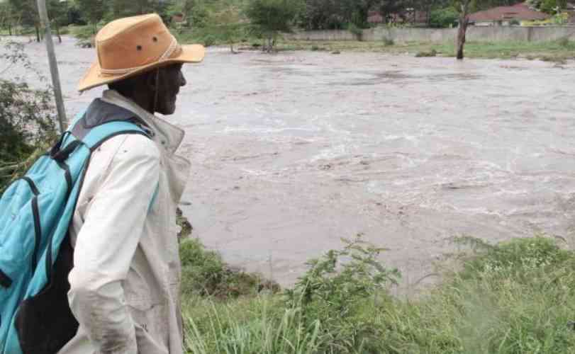 A man ponders next move as water rises at Mto Wa Mawe river in Athi River, Machakos County.[Peterson Githaiga, Standard]