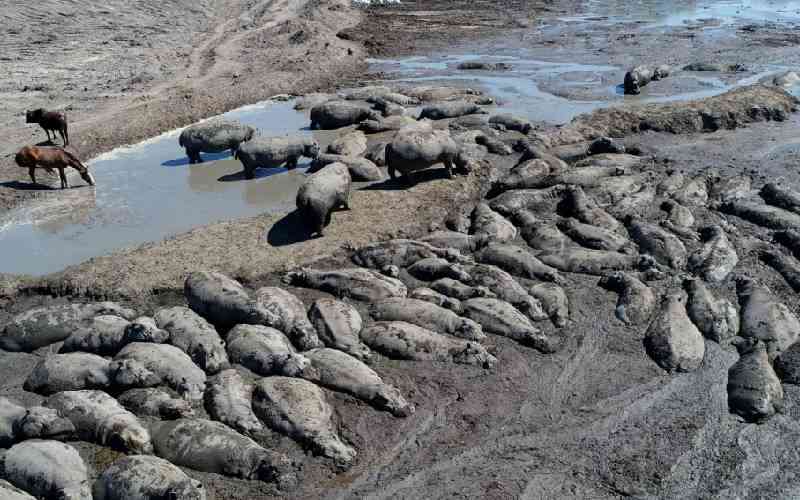 Hippos are stuck in a dried-up channel near the Nxaraga village in the Okavango Delta on the outskirts of Maun, Botswana, April 25, 2024. [AFP]
