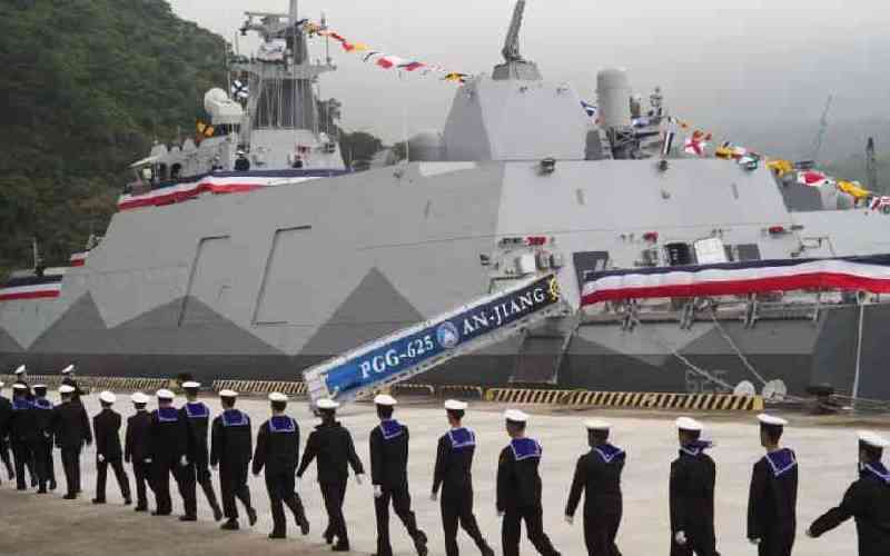 Navy soldiers walk past a Taiwan-made corvette warship during the inauguration ceremony in Yilan on March 26, 2024. [AFP]