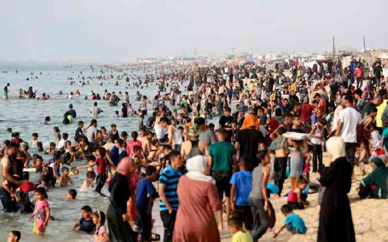 Palestinian family members displaced by the ongoing war with Israel seek relief from heat along the Mediterranean Sea at Khan Younis beach, Gaza Strip, May 20, 2024. [AP Photo]