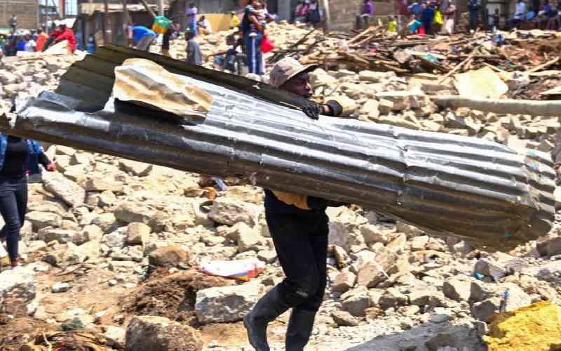 A man salvages iron sheets in Kosovo, Mathare after the demolition of houses built on riparian land on May 29, 2024. [ Robert Tomno, Standard]