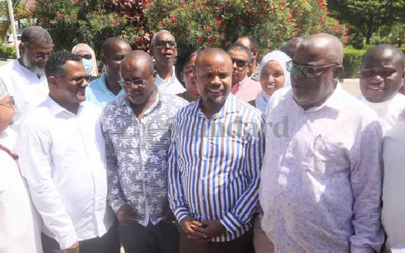 Coast Parliamentary Group led by their chairman, Dan Mwashako (in a stripped shirt) protests against Sale and chewing of Muguka in Coast region. [Omondi Onyango,Standard]