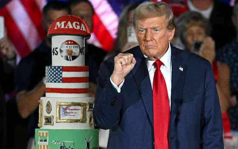 Former US President and Republican presidential candidate Donald Trump gestures next to his birthday cake, created by Club 47, during a campaign rally as he celebrates his 78th birthday at West Palm Convention Center, in West Palm Beach, Florida, on June 14, 2024. [AFP]