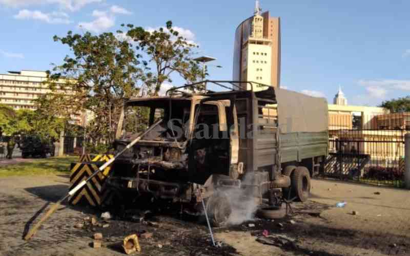 Torched police truck outside Parliament on June 25, 2024. [Collins Kweyu, Standard]