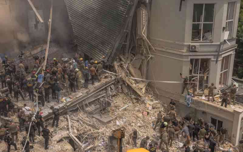 Emergency and rescue personnel along with medics and others clear the rubble of the destroyed building of Ohmatdyt Children's Hospital following a Russian missile attack in the Ukrainian capital of Kyiv on July 8, 2024, amid Russian invasion of Ukraine. [AFP]
