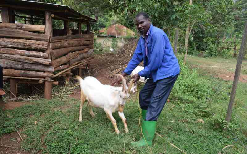 Pure Self Help Group Chairman Joas Okello was getting hold of a male goat of Saanen breed in his home at Bonde Village in Rachuonyo South Sub-county. [James Omoro, Standard]