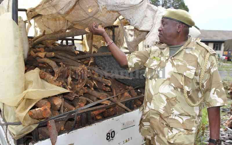 Baringo KWS Senior Warden Kenneth Nashuu inspects recovered sandalwood at the Kabarnet Police Station on October 28, 2015. [File, Standard]