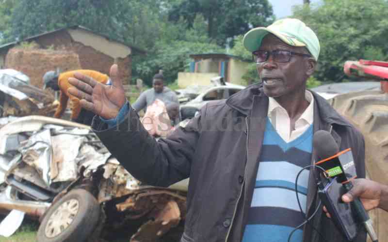 Simon Koskey, a relative of the five family members from Marakwet who perished in a grisly road accident at Marugusi area along the busy Malaba-Eldoret highway speaks at Lumakanda police station on August 26, 2024. [Benjamin Sakwa, Standard]