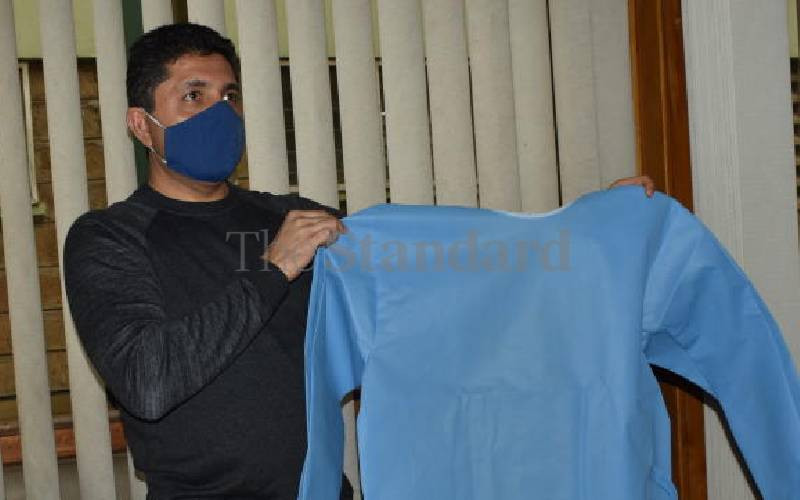 Manchester Outfitters Executive Director Rajesh Galot displaying sample of Surgical gown produced locally by the firm against Covid-19 pandemic. [Samson Wire, Standard]