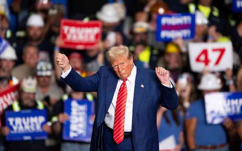Former US President and Republican presidential candidate Donald Trump dances to a song as he leaves a rally at 1st Summit Arena at the Cambria County War Memorial in Johnstown, Pennsylvania, on August 30, 2024. [AFP]