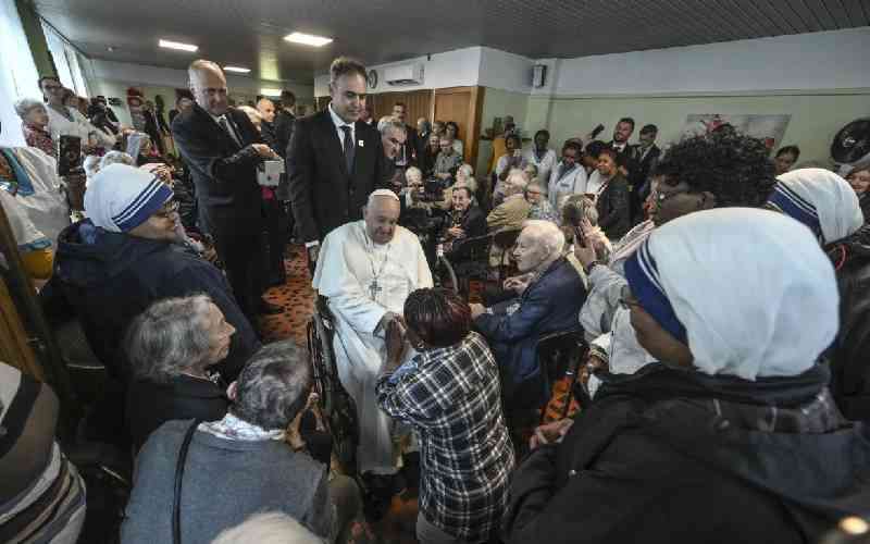 Pope Francis (C) meets residents during a visit at the Home Saint-Joseph, a residence for elderly in economic difficulty helped by the Little Sisters of Charity, in Brussels, on September 27, 2024, during his visit to Belgium. [AFP]