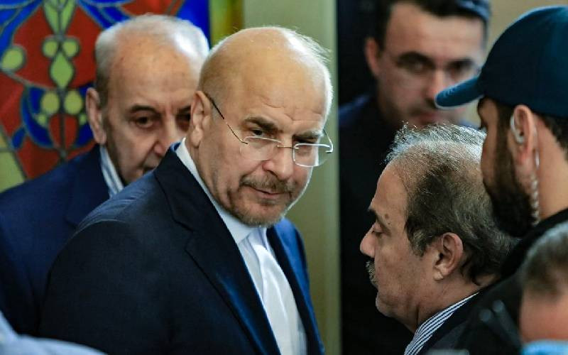 Iran's Parliament Speaker Mohammad Bagher Ghalibaf (second left) and his Lebanese counterpart Nabih Berri (left) after a meeting in Beirut on October 12, 2024. [AFP]