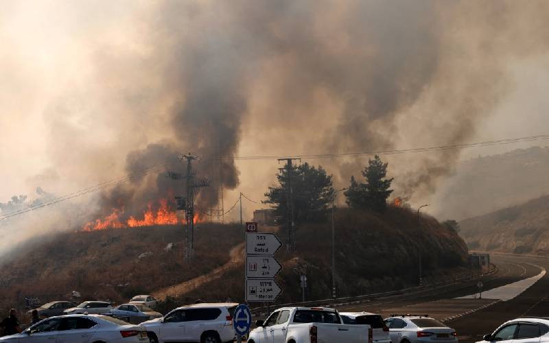 A fire rages on a hill after rockets were fired from southern Lebanon, on the outskirts of Rosh Pinna in the Upper Galilee on October 20, 2024, amid the ongoing war between Israel and Hezbollah. [AFP]