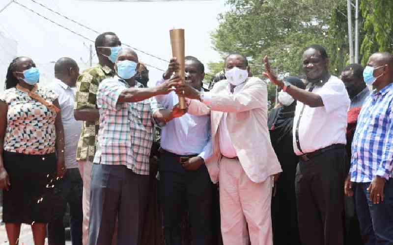 When Chief Executive officer of East Africa Chamber of Commerce, Charles Kahuthu [wearing white face mask] was joined by Mombasa County officials to light the Africa trade torch a long Moi Avenue in Mombasa on Jan 20, 2021. [Omondi Onyango, Standard]