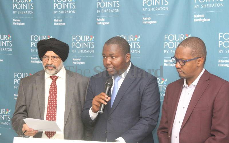 Eric Githua, chairman of the Alcoholic beverages association of Kenya(ABAK), flanked by Pushpinder Singh Mann(Left) vice chair ABAK and Eric Kiniti (Right)secretary ABAK address the press on the waste regulations which they say will increase cost of business by 70 per cent. [Edward Kiplimo,Standard]