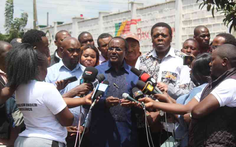 Wiper Party Leader Kalonzo Musyoka flanked by Kitui Senator Enoch Wambua (left)and DAP-K leader Eugene Wamalwa (right) during a media briefing at Nairobi Funeral Home on February 1, 2025. [Benard Orwongo, Standard]