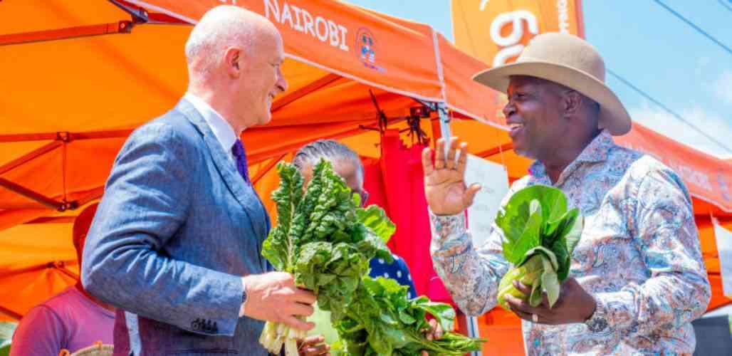 Italian Ambassador to Kenya Roberto Natali (left) with Kisumu Deputy Governor Mathew Owili, during the launch of the "Nairobi Farmers Market" at Rosslyn Square Shopping Center in Nairobi. [David Gichuru, Standard]
