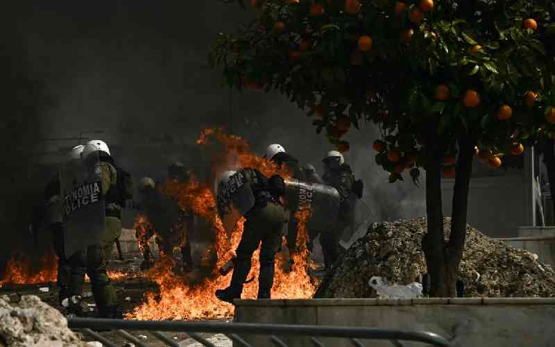 Riot police officers take cover from molotov cocktails thrown by demonstrators as clashes break out during a rally as part of a general strike called by unions to mark the second anniversary of the country's worst rail tragedy that left 57 dead on February 28, 2023.[AFP]