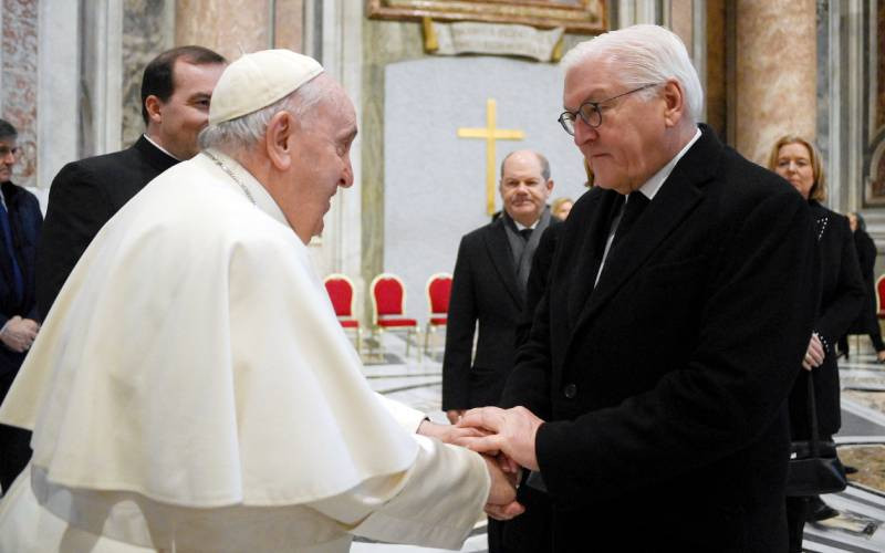 Pope Francis shaking hands with German President Frank-Walter Steinmeier during Pope Emeritus Benedict XVI funeral mass at St Peter's square in the Vatican.[AFP]