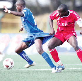 NOT SO FAST PAL: Western Stima’s Brian Masiolo puts the breaks on Nairobi City Stars’ Levy Muaka at City Stadium on Sunday. Photo: Staffor Ondego Stan