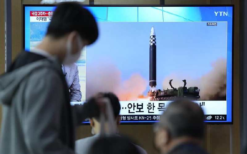 A TV screen showing a news program reporting about North Korea's missile launch with file footage, is seen at the Seoul Railway Station in Seoul, South Korea October 9, 2022. [AP Photo]