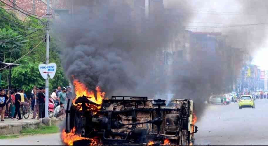 Smoke billows from a vehicle allegedly burned by the Meitei community tribals protesting to demand inclusion under the Scheduled Tribe category, in Imphal, the capital of India's Manipur state, on May 4, 2023. [AFP]