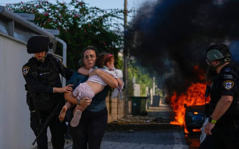 Police officers evacuate a woman and a child from a site hit by a rocket fired from the Gaza Strip, in Ashkelon, southern Israel, October 7, 2023. [AP photo]