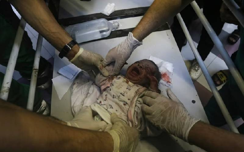 A wounded Palestinian baby receives treatment at the al-Shifa hospital, following Israeli airstrikes on Gaza City, central Gaza Strip, Oct. 23, 2023. [AP Photo]