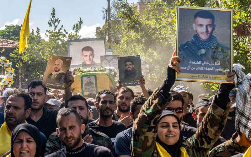 Family members react during the funeral for Raed Khattab, a fighter of the Lebanese Shiite movement Hezbollah, who was killed in Israeli bombardment on the village of Aita al-Shaab near the border with Israel in south Lebanon on August 23, 2024. [AFP]