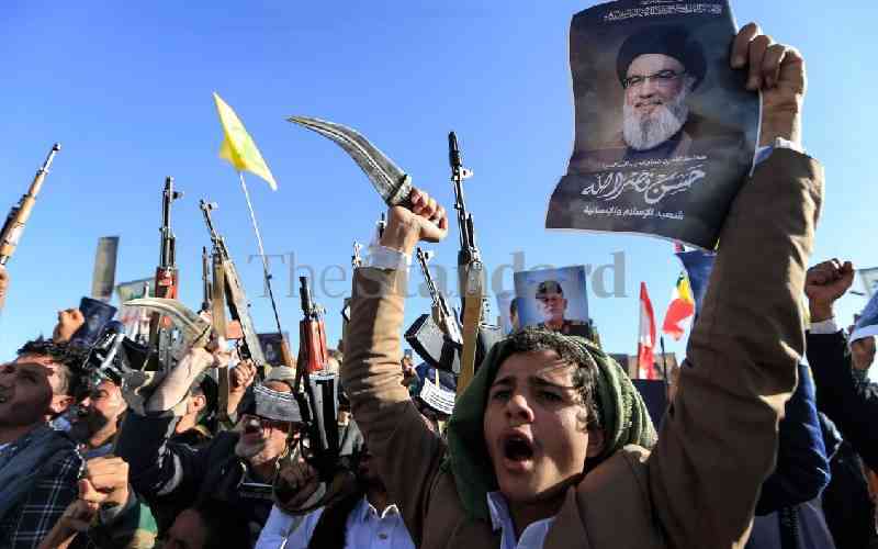 A young Yemeni man lifts a picture of slain Lebanese Hezbollah leader Hassan Nasrallah and a dagger, during a rally held in the Huthi-controlled capital Sanaa on October 4, 2024, in protest against Israel's attacks on Lebanon and the ongoing war between Israel and Hamas militants in the Gaza Strip. The US military said on October 4 that it struck 15 targets in areas of Yemen controlled by Huthi rebels, who have fired missiles at Israel and repeatedly attacked global shipping in the Red Sea. [AFP]