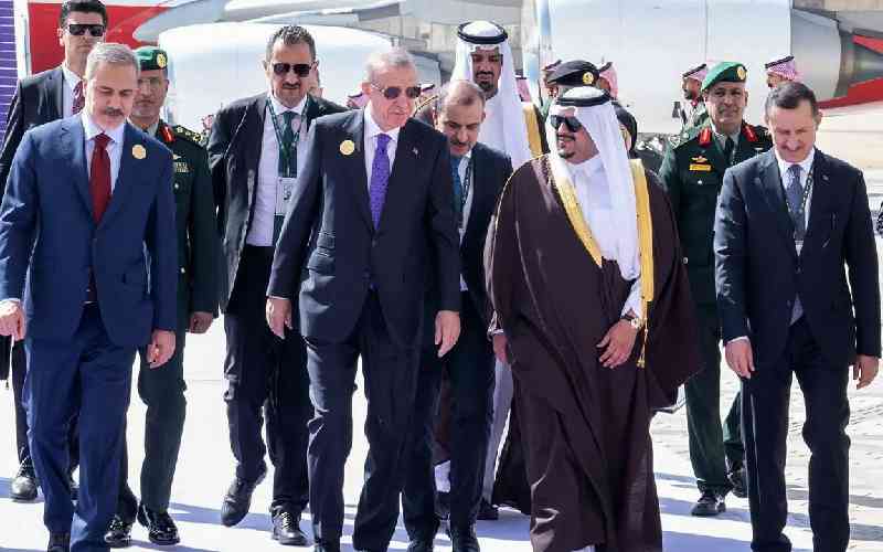 Saudi Deputy Governor of the Riyadh region Prince Mohammed bin Abdulrahman bin Abdulaziz (C-R) welcoming Turkey's President Recep Tayyip Erdogan (C-L) in Riyadh ahead of the Organization of Islamic Cooperation (OIC) and the Arab League joint extraordinary leaders summit on Nov 11, 2024. [AFP]