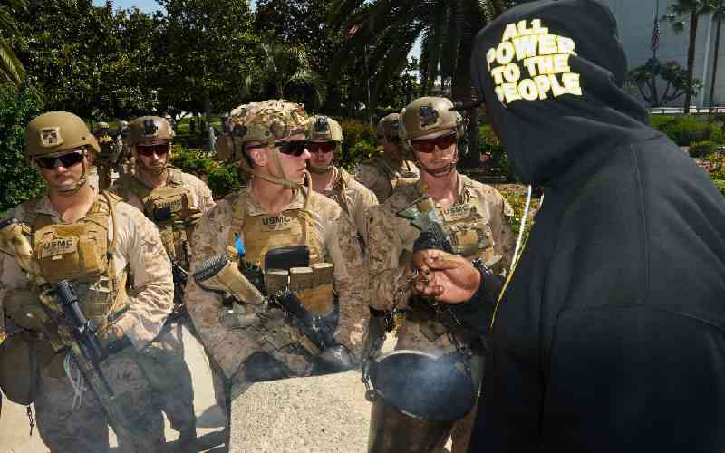 A demonstrator burning sage speaks to US Marines from 2nd Battalion, 7th Marines, standing guard at a protest condemning the US and Israeli strikes on Iran, outside the Westwood Federal Building in the Westwood neighborhood of Los Angeles, on June 22, 2025. [AFP]
