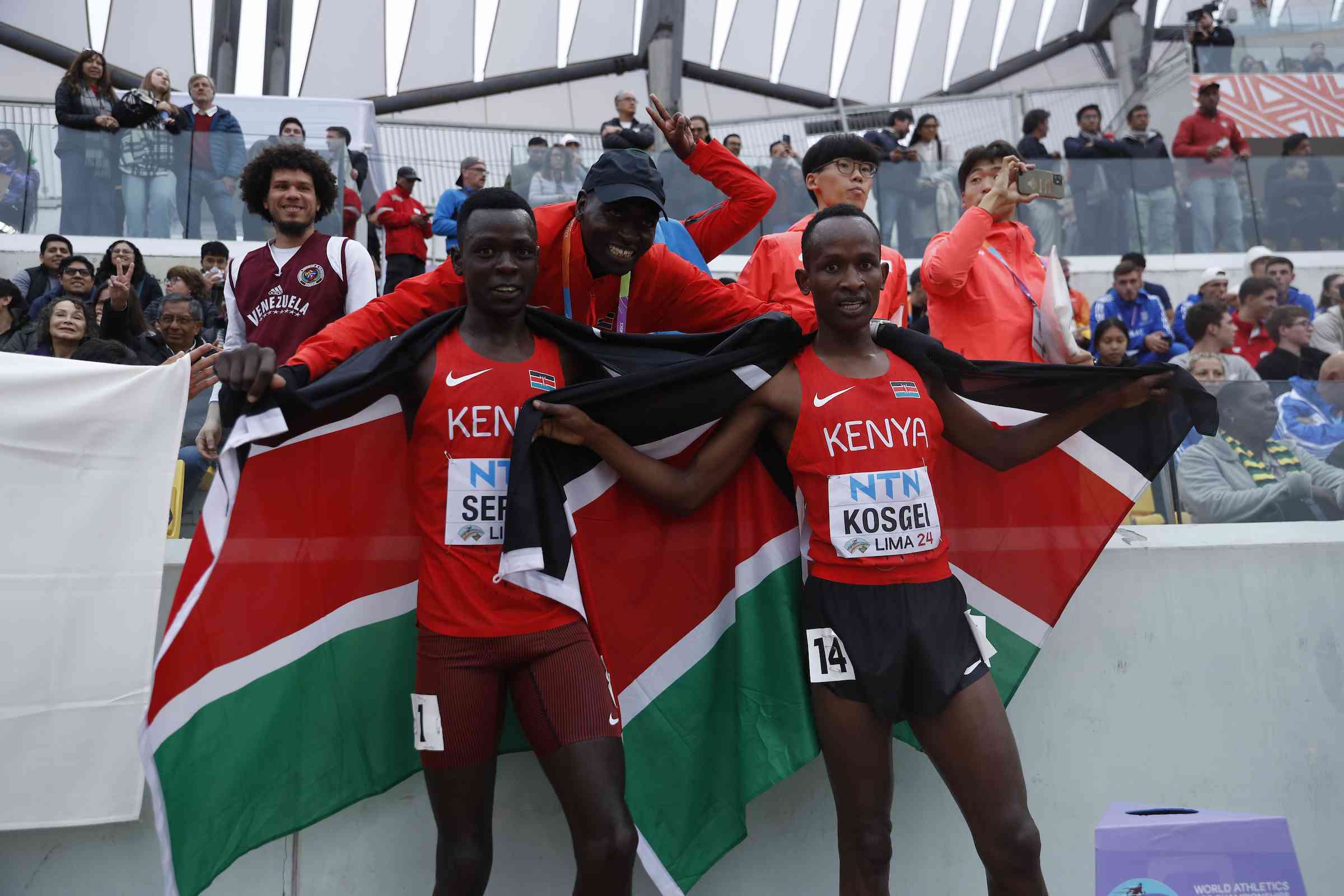 Edmund Serem and Mathew Kosgei celebrate after winning.[World Athletics]