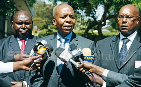 | Transport Cabinet Secretary Michael Kamau addresses journalists after a meeting with parastatal heads in his ministry in Nairobi, Wednesday. He is flanked by Infrastructure Principal Secretary John Mosonik (left) and his Transport counterpart Nduva Muli. [Photo: Jonah Onyango/Standard] |