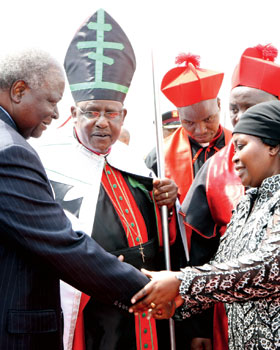 President Kibaki consoles Mrs Bertha Mwangi during the burial of her husband Archbishop Samson Mwangi Gaitho in Ruiru. Looking on is Gaitho's successo