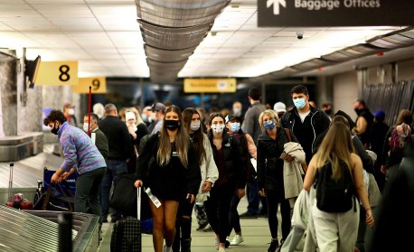 Travelers wearing protective face masks to prevent the spread of the coronavirus disease reclaim their luggage at the airport in Denver, Colorado, US. [Reuters]