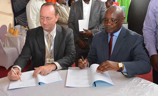 Kisii County Governor James Ongwae (right) and Liquid Telecom Chief Commercial Officer Paul Statham sign an agreement at Kisii Entrepreneurship Summit. Liquid Telecom and the Kisii government will partner to provide free Wi-Fi in the county. [PHOTO: DENISH OCHIENG/ STANDARD]