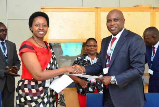 Deputy Executive Director -UNHabitat- Dr. Aisa Kyawira (L) and Acting Managing Director- Shelter Afrique. Mr. Femi Adewole (PHOTO: James Wanzala,Standard)