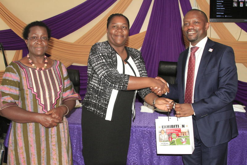 Standard Group CEO Orlando Lyomu receives a gift from Prof Francis Imbuga's daughter Doris Mbugua during the launch of an exhibition of the writer's works at the Kenya National Archives in Nairobi on Monday. Looking on is former Jomo Kenyatta University of Agriculture and Technology Vice Chancellor Mabel Imbuga. [David Njaaga, Standard]