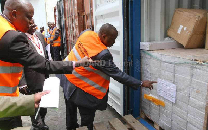Parliamentary Committee on Trade, Industry and Cooperatives Chairman Kanini Kega (left) and Nairobi Importers and Small-scale Traders Association Chairman Ben Mutahi inspect a container at the Nairobi Inland Container Depot when the House committee toured the facility last week. [Jonah Onyango, Standard]