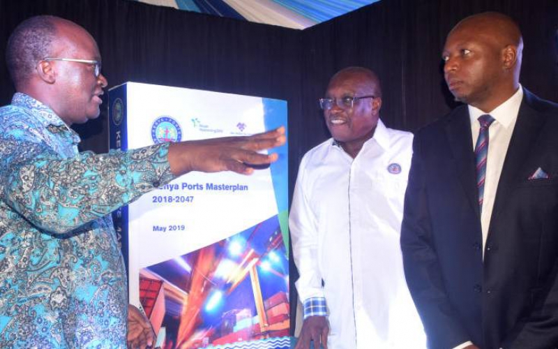 Kenya Ports Authority (KPA) chairman General Rtd Joseph Kibwana (centre) and KPA managing director Dr. Daniel Manduku (right) looks on as the Cabinet Secretary for Transport, Infrastructure, Housing, Urban Development and Public Works James Macharia (left) drives a point after the unveiling of the KPA's Master Plan for 2018-2027, August 07, 2019 at the Sarova Whitesands Beach Resort. [Gideon Maundu/Standard]
